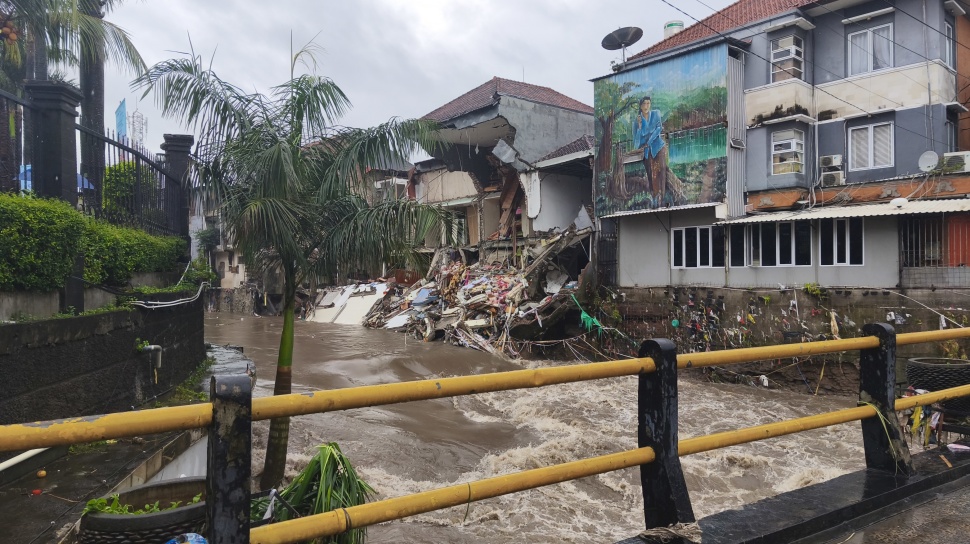 Separuh bangunan ruko telah lenyap ke dalam sungai, menyisakan puing-puing beton yang menjadi saksi bisu tragedi tersebut.