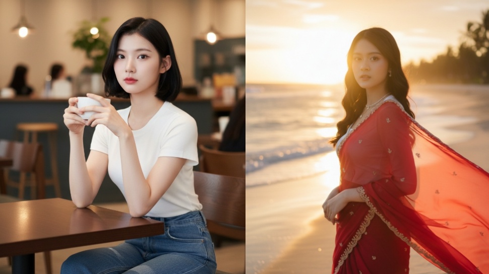 Mengapa Efektif? Dengan "close-up wajah" dan permintaan "detail rambut, riasan, bintik-bintik", Anda mengarahkan AI untuk mempertahankan ciri-ciri spesifik yang membuat seseorang unik. "Tertawa lepas" memberi ekspresi yang hidup, dan "sinar matahari pagi keemasan" menambah mood tanpa mengubah struktur wajah. "Gaya editorial, resolusi tinggi" memastikan kualitas gambar yang tajam.