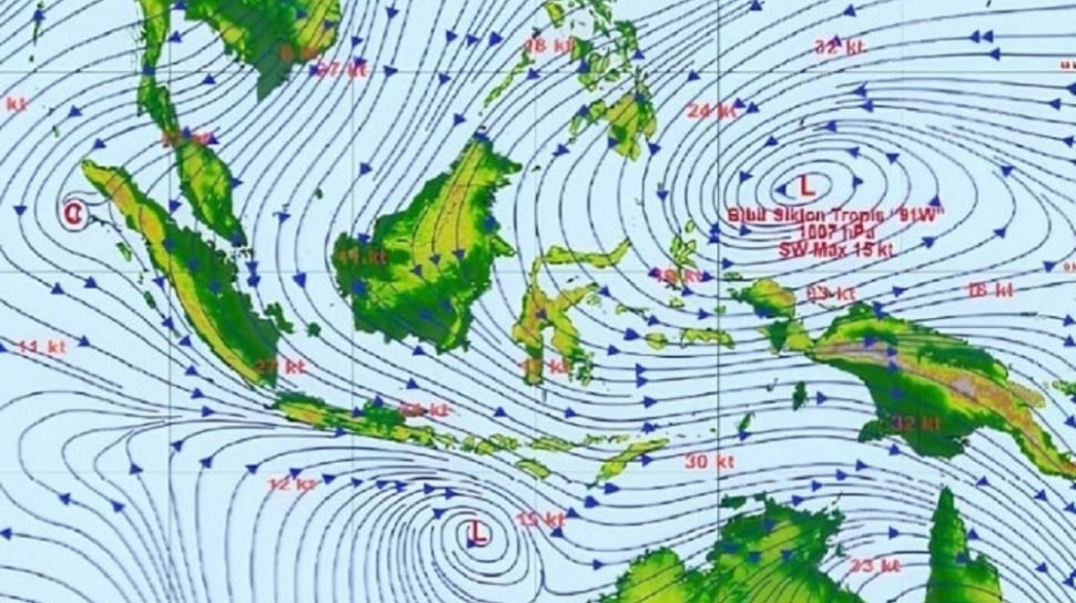 - Kombinasi pusat tekanan rendah dan Monsun Asia menguatkan pembentukan awan hujan di Jawa hingga Kepulauan Sunda Kecil.