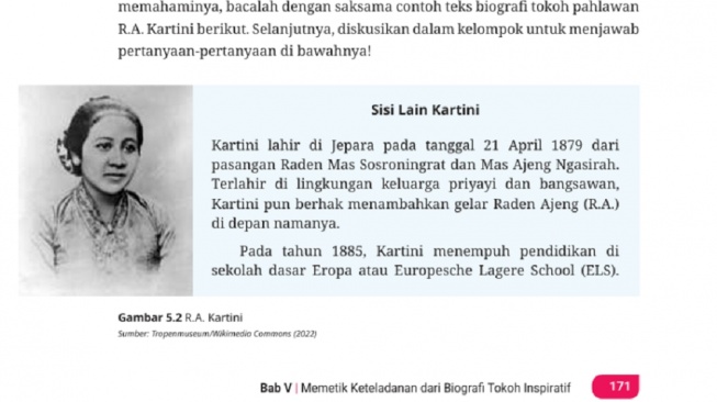 Melansir dari buku Bahasa Indonesia untuk SMA/SMK Kelas X (2023) karya Fadillah Tri Aulia, Sefi Indra Gumilar, dan Alvian Kurniawan, dalam halaman 171 siswa diberi tugas untuk memahami contoh teks biografi tokoh pahlawan R.A. Kartini.