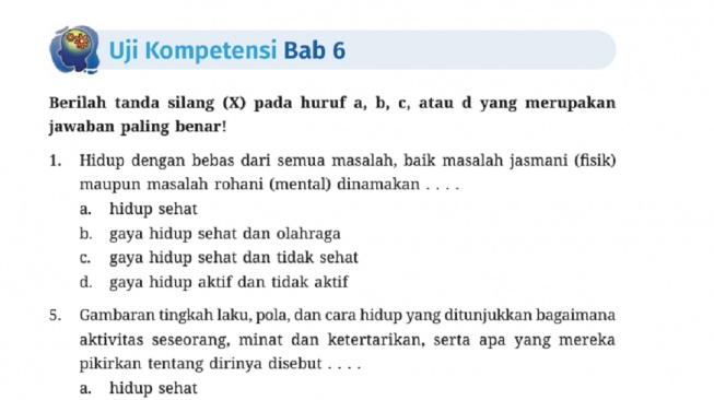 - Uji Kompetensi Bab VI mencakup soal pilihan ganda dan uraian mengenai hidup sehat dan gaya hidup remaja.