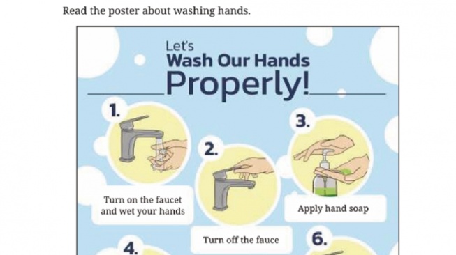 Di halaman 166 terdapat Poster mengenai Mencuci Tangan. Siswa diharapkan mampu memahami poster tersebut dan menjawab soal-soal di halaman 167. Berikut kunci jawaban Bahasa Inggris Kelas VIII Halaman 167.