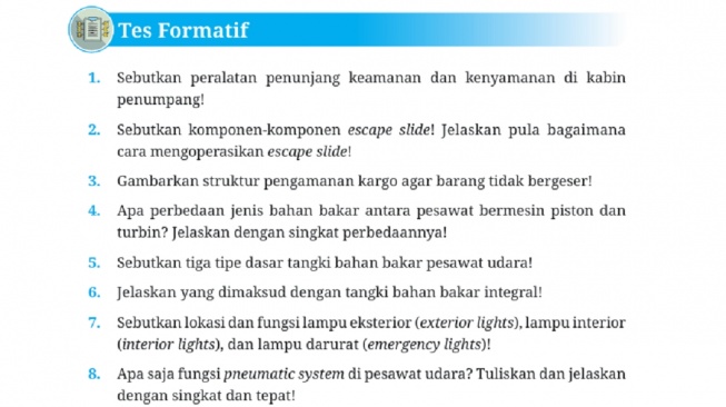 Pada halaman 182 terdapat soal Tes Formatif berupa uraian. Berikut kunci jawaban Dasar-Dasar Teknik Pesawat Udara Kelas X Halaman 182.