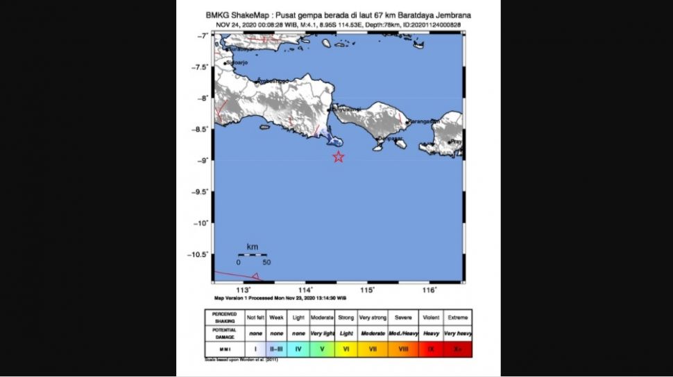 Gempa bumi itu berpusat pada titik koordinat 8.95 Lintang Selatan dan 114.53 Bujur Timur dengan kedalaman 78 kilometer. BMKG menjelaskan, gempa tersebut dirasakan skala II MMI di Badung, Bali.