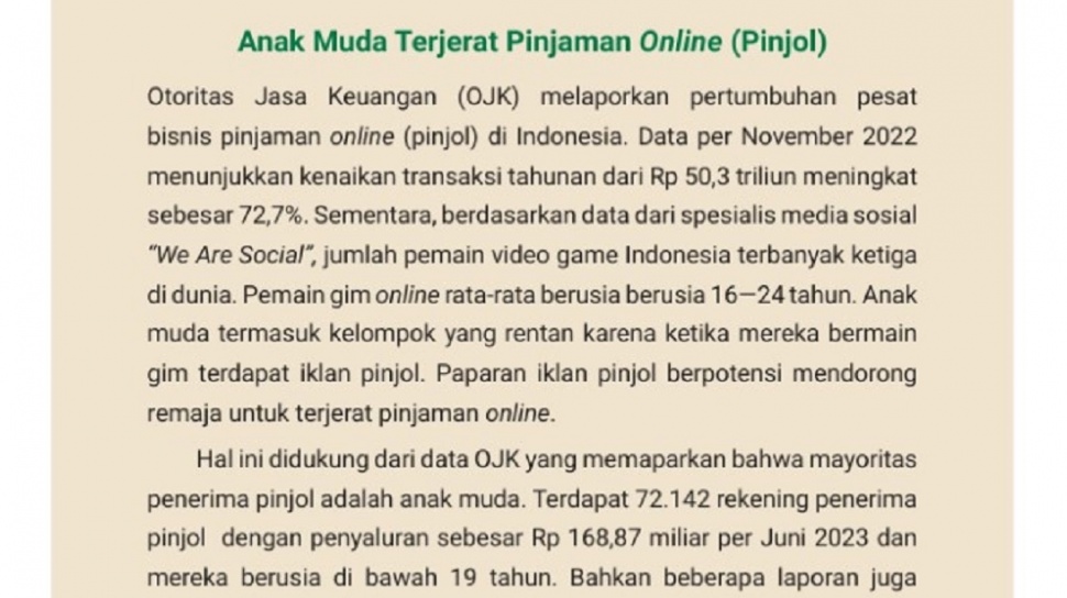 Dalam teks “Anak Muda Terjerat Pinjaman Online (Pinjol)” membahas mengenai data Otoritas Jasa Keuangan (OJK) per November 2022 soal bisnis pinjaman online di Indonesia meningkat 72,7%.