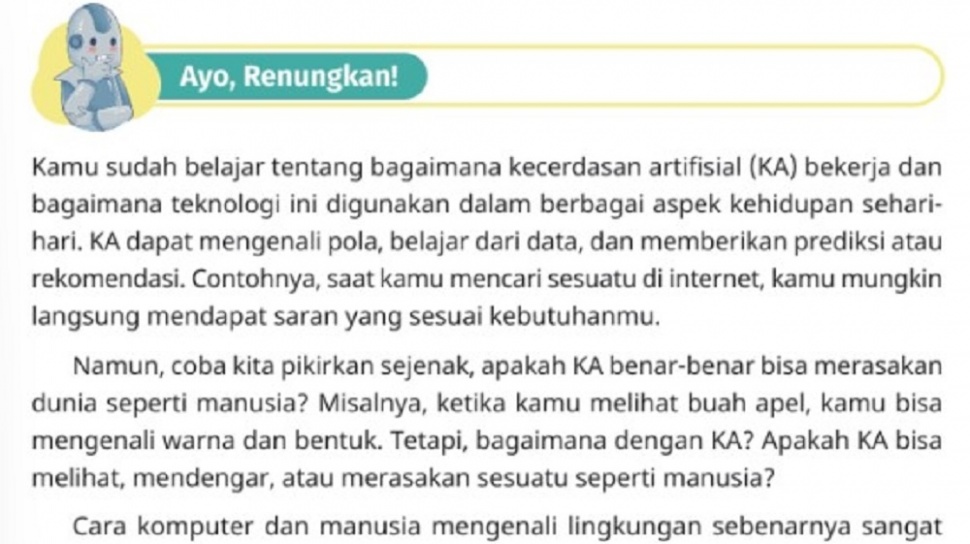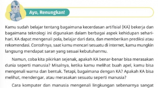Dalam teks ‘Ayo, Renungkan!’ tersebut menjelaskan mengenai bagaimana kecerdasan artifisial (KA) bekerja dan bagaimana teknologi tersebut digunakan dalam berbagai aspek kehidupan sehari – hari.