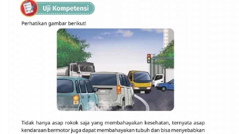 - Soal Uji Kompetensi halaman 93 meminta analisis gambar lalu lintas terkait dampak pencemaran udara terhadap perubahan iklim.