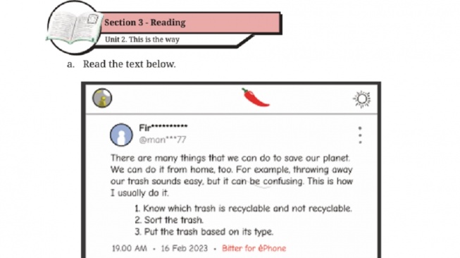 Melansir dari buku English for Nusantara untuk SMP/MTs Kelas VIII (2022) karya Ika Lestari Damayanti, Iyen Nurlaelawati, Mahmud Layan Hutasuhut, Yusnita Febrianti, Raymon Rahmadhani dan Gilang Asri Devianty, dalam Bab tersebut siswa diajarkan untuk bagaimana cara menyelamatkan bumi.