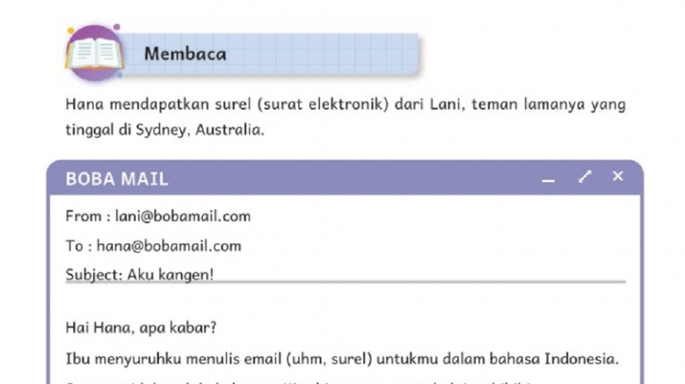 Dalam bab ini, terdapat 2 contoh surat elektronik (Surel). Surel yang pertama yakni dari Lani, Teman lama Hana yang tinggal di Sydney, Australia.