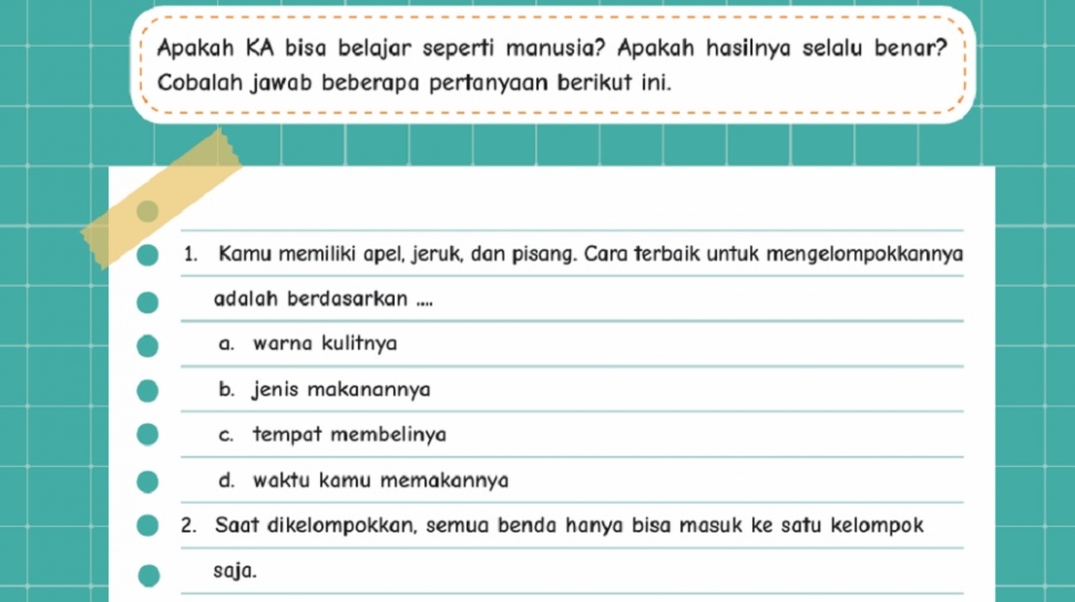 Apakah KA bisa belajar seperti manusia? Apakah hasilnya selalu benar? Cobalah jawab beberapa pertanyaan berikut ini.