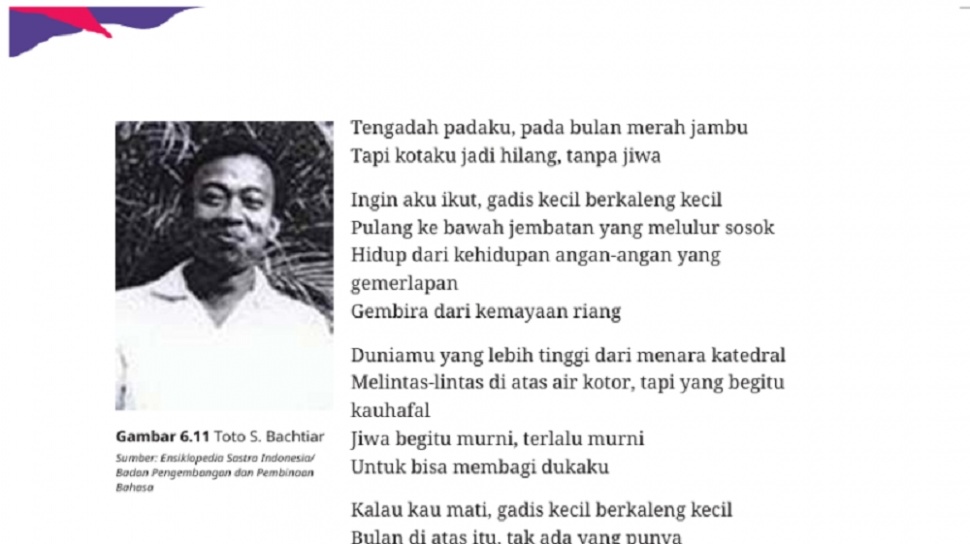 - Puisi "Gadis Peminta-Minta" karya Toto S. Bachtiar menggambarkan kesedihan, kemiskinan, dan ketidakberdayaan pengemis kota.
