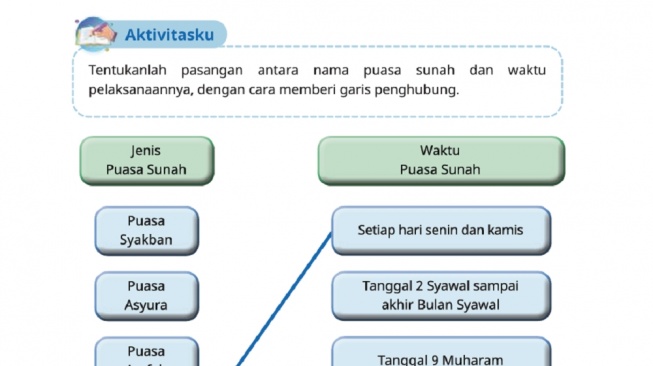 - Halaman 164 menyajikan soal latihan berupa aktivitas mencocokkan nama puasa dengan waktu pelaksanaannya menggunakan garis.