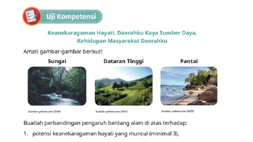 - Soal kompetensi meminta perbandingan pengaruh bentang alam (sungai, dataran tinggi, pantai) terhadap potensi sumber daya dan mata pencaharian.